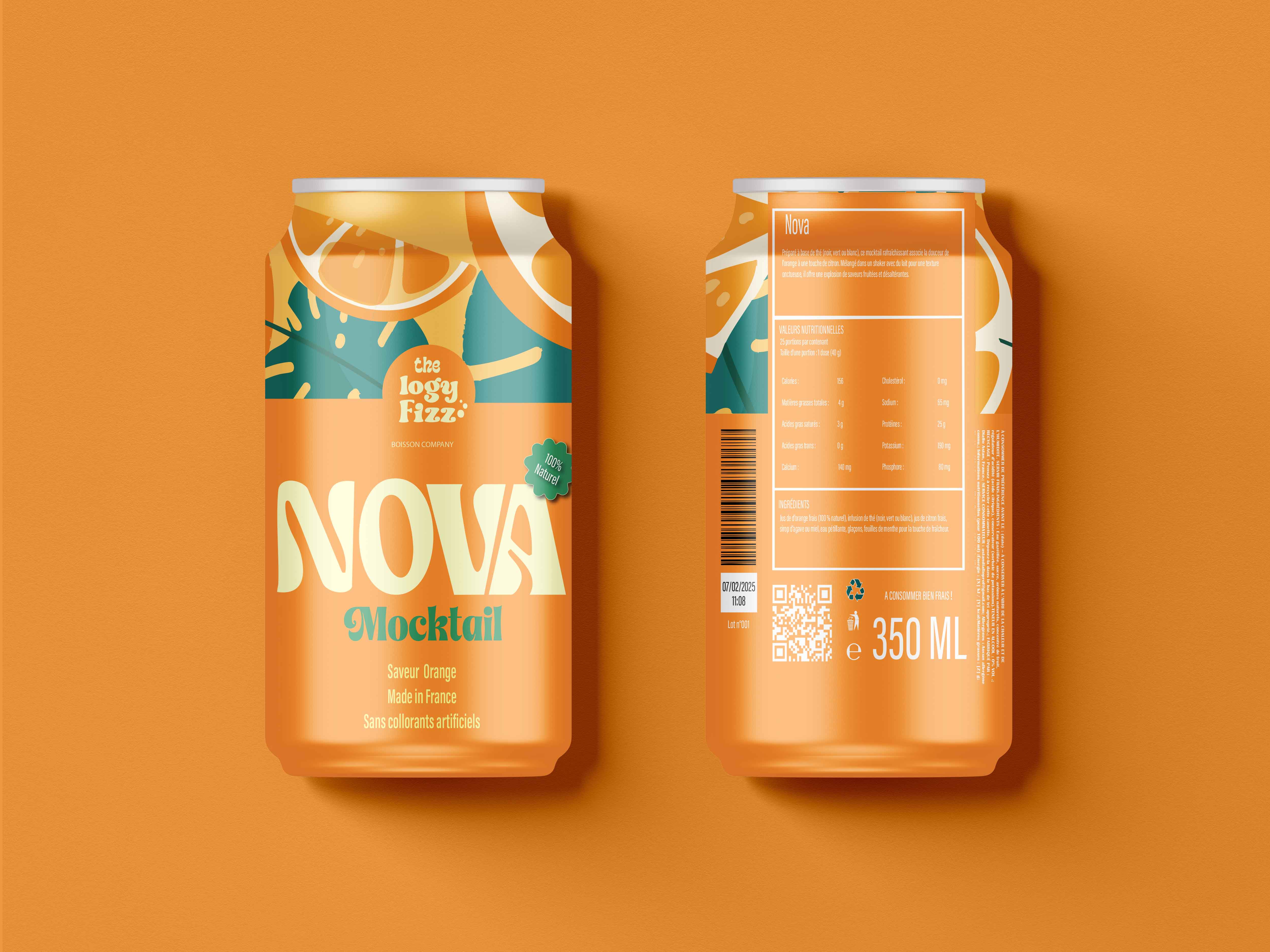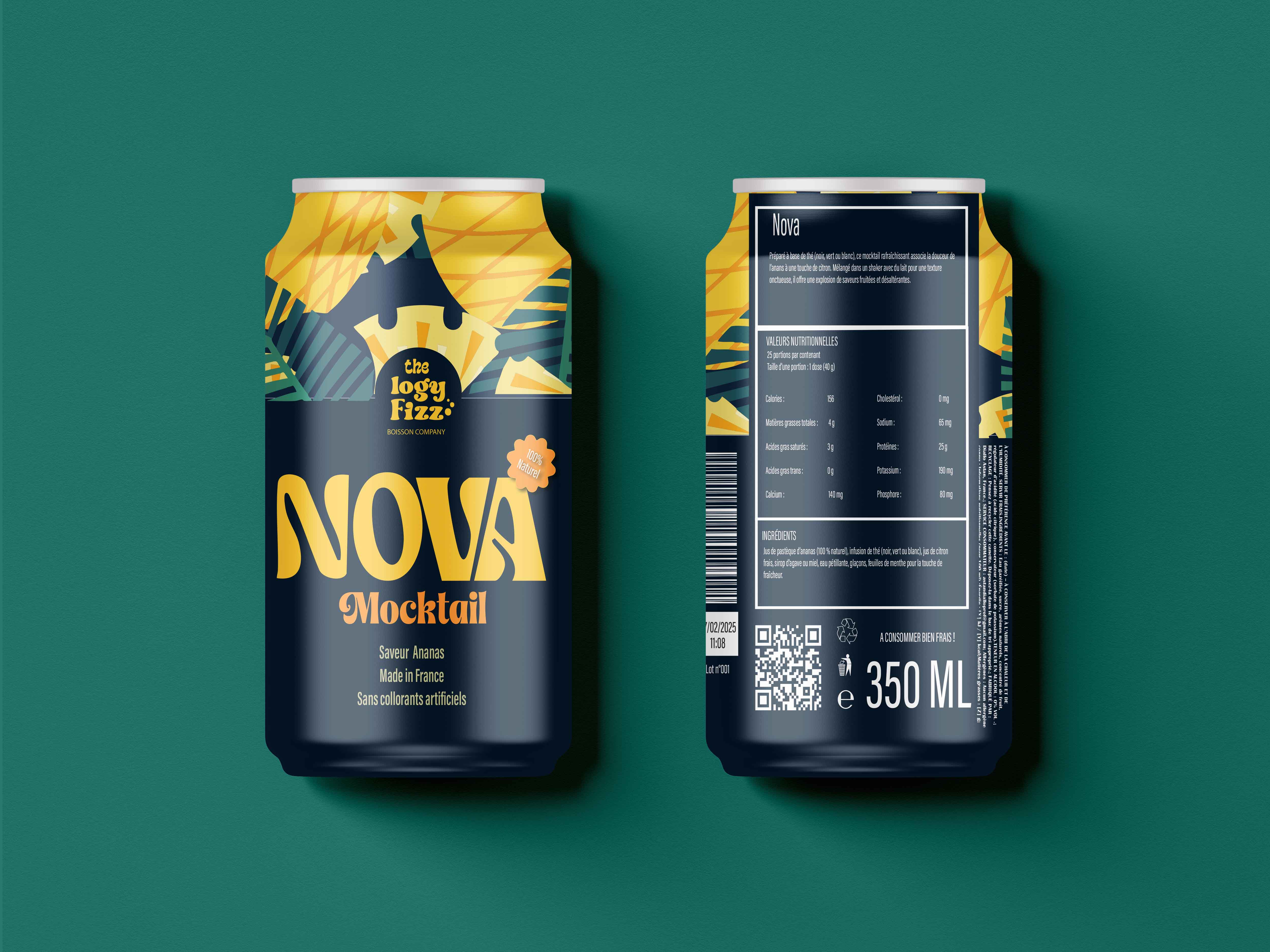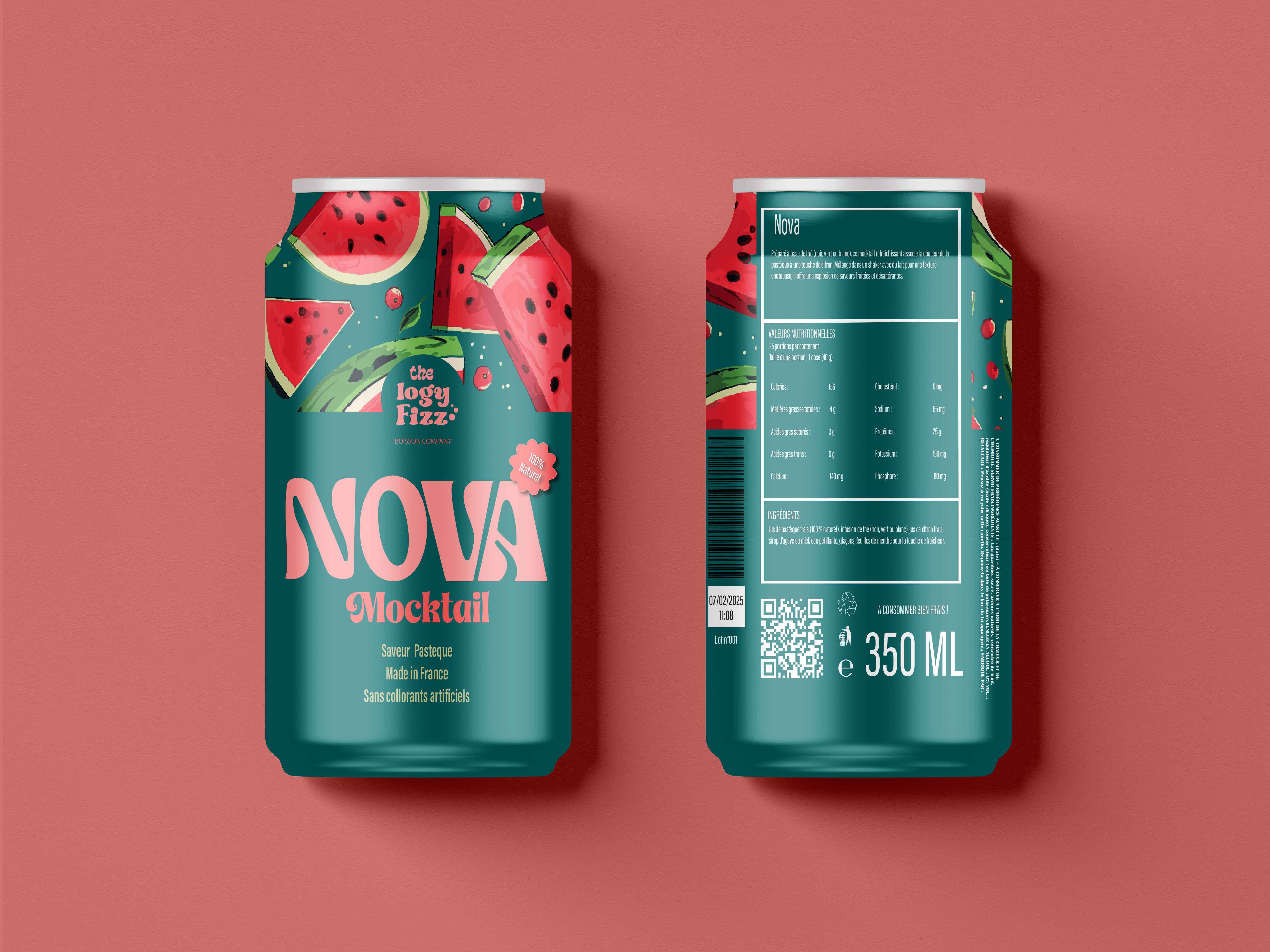 Creation of the packaging for a mocktail named Nova Mocktail. The goal was to design an attractive and modern can, highlighting the product’s freshness and innovation. The packaging needed to reflect the brand’s identity while adhering to technical constraints, including the integration of legal mentions in a small format.